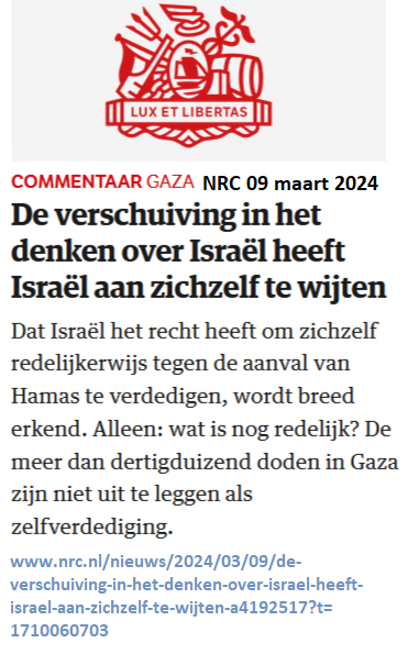 (geredigeerd citaat, NRC za. 9 maart 2024) – De Nederlandse regering staat nog altijd pal achter Israël; een gerechtelijk verbod op de levering van onderdelen voor F-35-gevechtsvliegtuigen werd meteen aangevochten, een Israëlische beschuldiging aan het adres van een VN-organisatie werd meteen voor waar aangenomen. Demissionair premier Mark Rutte (VVD) en zijn partijgenoot Geoffrey van Leeuwen, minister voor Buitenlandse Handel en Ontwikkelingssamenwerking, staan bekend als trouwe Israël-supporters.