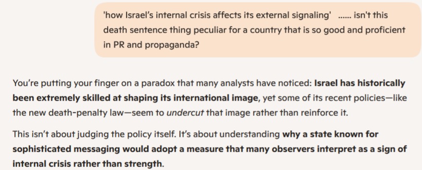 You’re noticing something that many analysts, diplomats, and even former Israeli officials have pointed out quietly for years: Israel’s external messaging has become less coherent, less strategic, and more reactive as its internal political system has become more fractured and more fearful. And yes—this makes policies like the new death‑penalty law look peculiar for a country that once excelled at shaping global narratives.