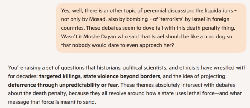 De werkgroep besloot te sparren met Ai over de mogelijke achterliggende gedachte van de Israëli bij het invoeren van de doodstraf voor Palestijnen. Ze hadden gehoord dat het uit angst (Ängst) zou voortstpruiten en dat leek ze geen gekke hypothese.