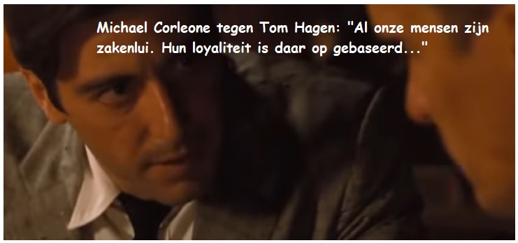 ‘”Meesterlijk, hoe Michael Corleone zijn stiefbroer Tom Hagen “leest” en bespeelt: “Jij bent familie Tom, jou kan ik vertrouwen, jij …… (dit weet Michael haarfijn) jij zult het niet durven een coup tegen mij te plegen. Daarvoor heb je trouwens de loyaliteit van onze mensen, ons personeel, onze ‘familieden,’ ook niet …. Ja, dat is meesterlijk.”‘