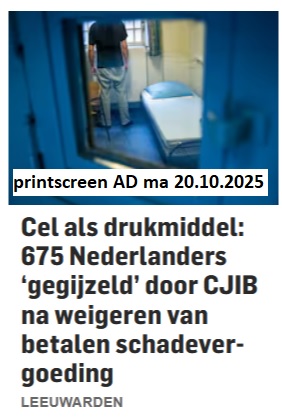 citaat AD, okt 2025: De mensen die worden gegijzeld, kunnen – afhankelijk van de uitspraak in de oorspronkelijke strafzaak – maximaal een jaar worden vastgezet. Dat betekent overigens niet dat ze dan geen schadevergoeding meer hoeven te betalen. „Die blijft staan. Vervangende hechtenis bestaat niet meer’’, zegt woordvoerder Jeichien de Graaff van het CJIB. „Maar zodra ze een betalingsregelingovereenkomst hebben en een aanbetaling doen, komen ze weer op vrije voeten.’’