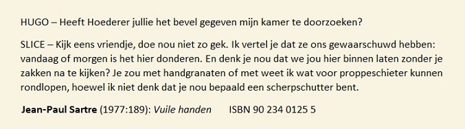 – ‘ Daarom moet je veel lezen en liefst “alles” lezen. Dat kan natuurlijk onmogelijk, maar ik bedoel: er is geen Hoge Literatuur en lage lectuur. Het hangt er maar net vanaf wat er in een bepaalde periode aan de orde is en je belangstelling heeft.’