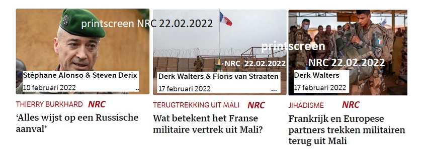 ‘ Begin met de berichten over de Franse militairen Die vertrekken uit Mali (waarom, dat moet je zelf uitvogelen). Tegelijkertijd wordt er gemeld dat ze met hun leger van alles willen doen om de dreiging uit het Oosten, van Rusland en Putin, het hoofd te bieden. Daar willen ze dolgraag Nederlandse militairen bij hebben, want de Duitsers staan niet te trappelen.