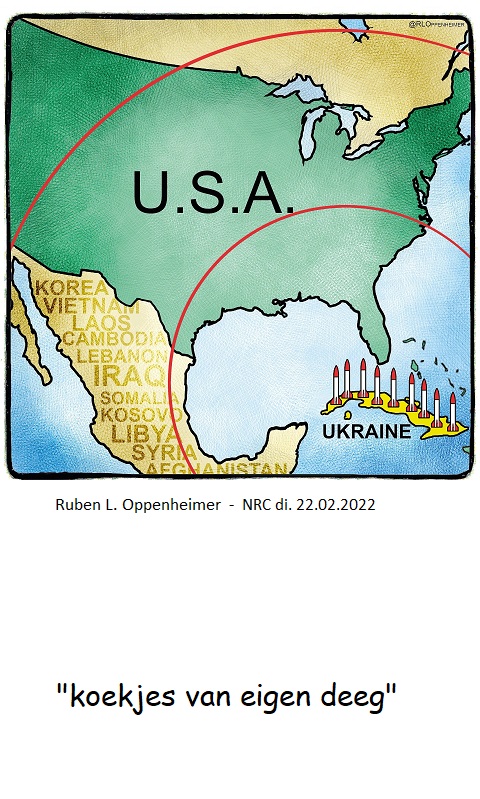 ‘ Van Boris Johnson naar de endeldarm is het niet ver lopen. Dat zie ik links in de tekening van Oppenheimer, waar Florida ligt: een gedraaide endeldarm met daarin de meeste van de regime-change-gevallen, Voornamelijk door de CIA.’