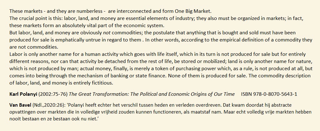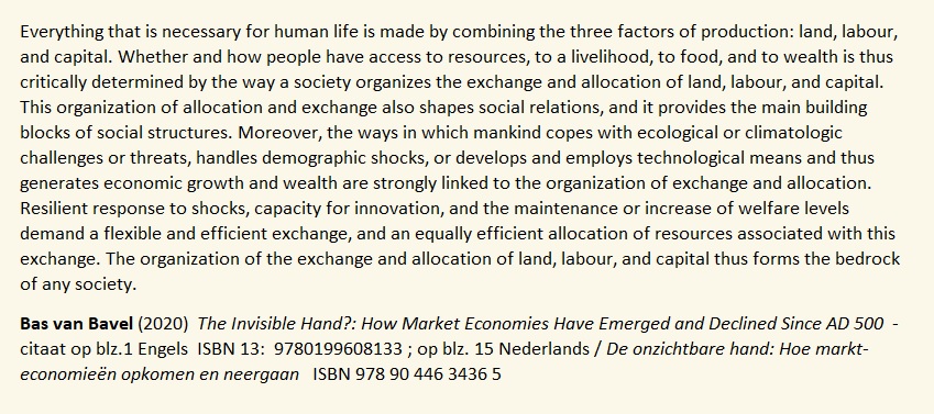 ‘ Heb jij dat boek van Van Bavel helemaal gelezen? Ik lees hier dat hij schrijft: “ The book will highlight how the subsequent rise of factor markets, and the economic opportunities and imperatives they bring, further pushes up economic growth, but also enables a few groups to privatize and accumulate financial assets, natural resources including land, and services. In the longer run this induces social polarization and a reduction in welfare for ordinary people. Also, the process engenders growing political inequality, as new market elites translate their economic wealth into political leverage, and it leads to institutional sclerosis. As the organization of factor markets thus becomes less favourable, and more skewed towards the interests of the market elites, economic growth stagnates or even turns into decline. Also, people start to retreat from the market, and factor markets shrivel again. The process thus ends in the decline of the market economy.”