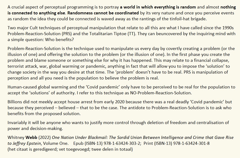 ‘Dat is wat mij betreft de grootste makke van de Wilders en zijn PPV: het is geen conventionele partij en dus weten de anderen niet hoe ze houvast aan die entiteit kunnen bewerkstelligen en dus zullen ze de PVV met alle macht buiten “de regering” proberen te houden. Intussen stichten ze met z’n allen zoveel mogelijk verwarring als maar kan. Meneer Remkes van de VVD begon al over nieuwe verkiezingen te raaskallen. Alles om de anomalie aan te wakkeren en te verduurzamen. “Ze” (dat wil zeggen de politieke nomenklatoera) moet dan ook nogal wat grote zaken tegelijk verhapstukken: ze willen de CBDC (controlestaat) invoeren, ze willen ons wederom massaal inspuiten met experimentele gentherapieën, de avonturen in de Oekraïne zijn een fiasco (daar gaan ze liefst doodstil aan voorbij; we horen niks meer over de Oekraïense overwinning op Rusland) en in Gaza willen de Haagse Kaasstolpers ook weer “geopolitiek” bedrijven. En al die tijd willen ze ons blijven af- en uitknijpen en ons ons geld aftroggelen. Kortom: onze aandacht moet dringend worden afgeleid.’