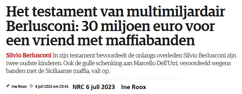 * * *   De Italiaanse oud-premier en mediamagnaat Silvio Berlusconi heeft in zijn testament laten vastleggen dat zijn twee oudste kinderen Pier Silvio en Marina samen 53 procent krijgen van Fininvest, de financiële holding van de familie. Berlusconi stierf op 12 juni op 86-jarige leeftijd, maar nu pas is zijn testament voorgelezen.