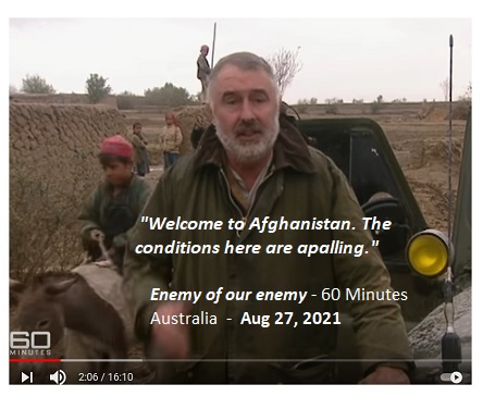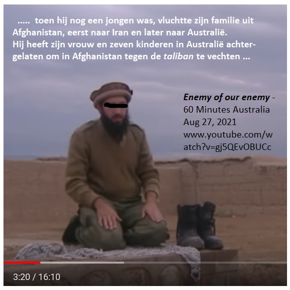 ‘ Wat zou het verhaal achter deze Australische video zijn? Het echte verhaal bedoel ik. Deze Australische Afghaan zou naar Afghanistan zijn teruggekeerd om er met de Noordelijke alliantie tegen de taliban te vechten. Van deze onderneming wordt een video gemaakt waarop hij zeer herkenbaar in beeld is gebracht. Dat vind ik opmerkelijk.’