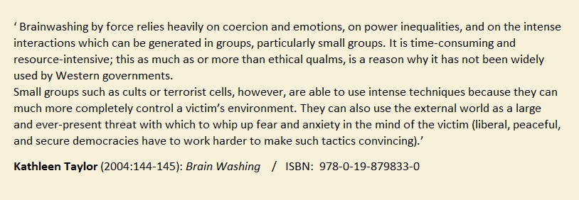 Wat Kathleen Taylor beweert over hersenspoelen en kleine groepen, gaat dan ook niet meer op wat betreft die beperking van kleine groepen. We kunnen tegenwoordig op nationale en supranationale schaal gehersenspoeld worden en dat gebeurt dan ook volop.’