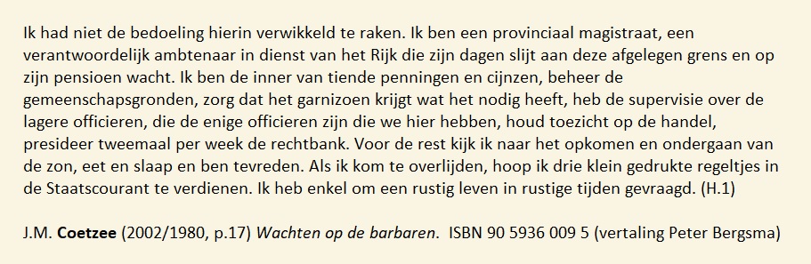 - ‘”Jawel, dat is zo, maar dan ging het om belangrijke politici, in elk geval om politiek actieve personen met een publiek profiel en uitgesproken opvattingen; het grootste deel van de huidige politici echter bestaat uit grijze muizen, bureaucratisch voetvolk dat orders opvolgt en daarnaast vooral eigen belangen nastreeft en behartigt. Als je onder die populatie af en toe opruiming houdt – uit privé-overwegingen (daar lezen we bij JS Mill over) – zou dat democratie-verhogend kunnen werken, omdat die zombies een zwaard van Damocles boven de fontanel wisten hangen. Ik probeer maar wat te bedenken hoor. “Afgestraft worden” middels verkiezingen werkt gewoon niet, omdat de zombies geen persoonljke verantwoordelijkheid voelen en weten dat ze overal mee wegkomen. Het systeem zou grondig op de schop moeten, want wat nog democratie heet en zo wordt genoemd, is natuurlijk al lang geen echte democratie meer. Nou, ga daar maar eens aanstaan.”‘