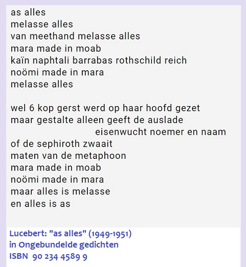 – ‘ Dat klopt. Weten ze wie Borges is, en Kafka? Ik betwijfel het. In eerste instantie ging het mij om het gedicht “as alles” – vanwege de cryptische woorden als moab, naphtali, barabbas ….. Wat of wie zijn dat? Opzoeken en in context plaatsen s.v.p.! En géén woke gewauwel!’