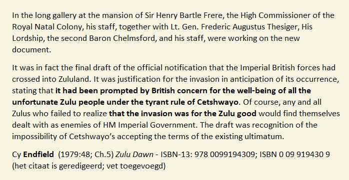 • ‘” De Engelsen waren hun tijd dus ver vooruit? Of liepen de Zulu achter? De Engelsen vielen Zulu-land binnen om de Zulu’s te bevrijden van Cetshwayo’s tirannie. Dat deden ze bijvoorbeeld ook in Afghanistan (met de Amerikanen, de EU en de NAVO) om de Afghanen te bevrijden van de tirannie van de Taliban, en de Afghaanse vrouwen en meisjes te emanciperen. Nu willen ze de Russen bevrijden van de tirannie van Vladimir Putin, via de Ukraïne onder meneer Zelensky. Is Zelensky eigenlijk een zionist? Zelensky is toch van J/joodse origine? De Engelsen waren al beschaafd, toen de Zulu nog als wilden en barbaren rondliepen.”‘