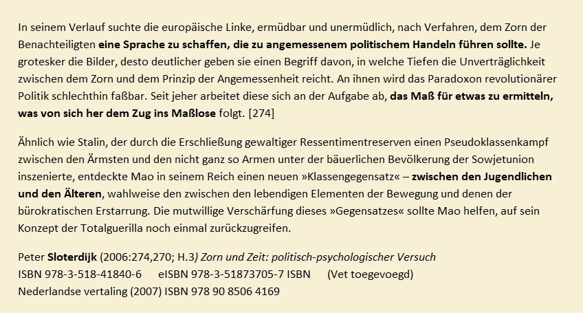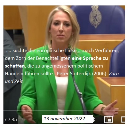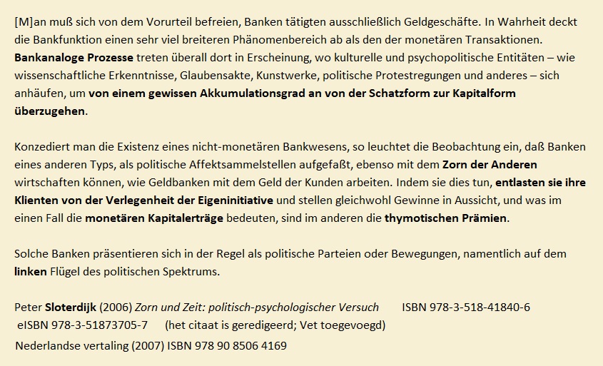 (De) linkse politieke partijen (mw. Marijnissen werkt voor het merk SP) slagen er maar niet in om profijtelijk te bankieren (te woekeren) met de woedetegoeden (de onvrede, de Thymos) van hun respectieve (natuurlijke) achterbannen. Die onvrede zouden zij als professionele politici moeten kunnen omzetten, transformeren, in productieve en effectieve politiek, op de eerste plaats ten behoeve van het klootjesvolk – maar niet alleen natuurlijk.