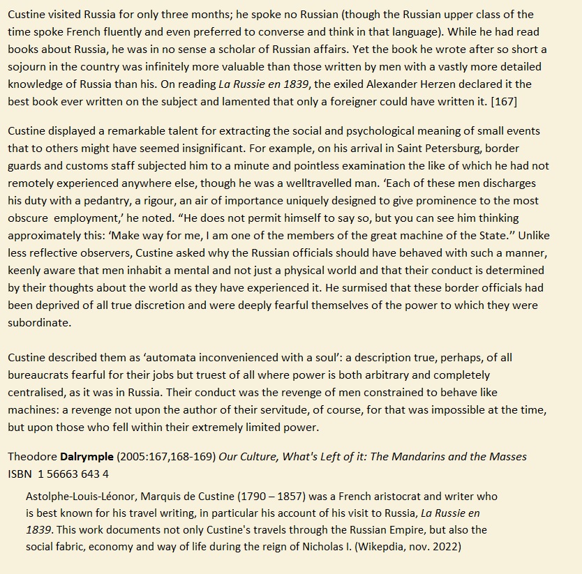 – ‘ Neen, dat niet, maar vanwege de bullshit jobs. Uit wat Custine (volgens Dalrymple) schrijft begrijp ik dat deze jongens in Rusland helemaal niet vonden dat ze bullshit jobs hadden. Integendeel. In Custine (Derde brief, 11 juli 1839) lees ik weliswaar iets over de douane, maar niet zo uitgebreid als Dalrymple vertelt. Misschien komt dat verderop nog.’