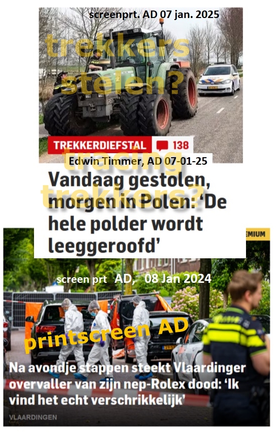 geredigeerd citaat artikel Edwin Timmer, AD 07-01-25 – Trekkerdiefstal – Roversbendes die het voorzien hebben op dure tractoren en landbouwmachines vormen een ware plaag op het platteland. Boerenfamilies zijn verbaasd over de brutaliteit van de daders. Ze gaan ongestoord te werk, ondanks de aanwezige beveiligingscamera’s ,,Onze trekkers zijn inmiddels gelokaliseerd: die staan in Roemenië.”